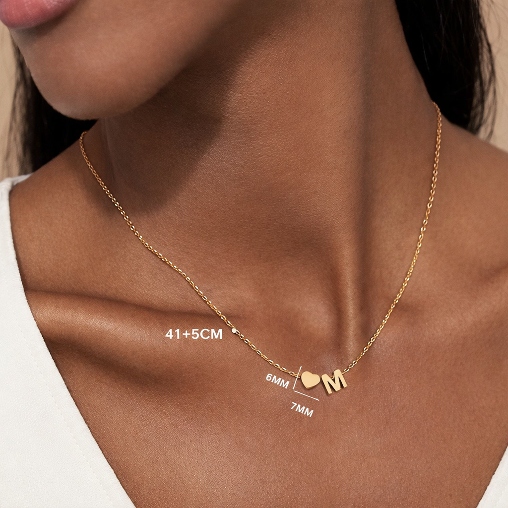 Collar con inicial y corazón en tono dorado o plateado que realza tu estilo. Su cadena ajustable de 41 + 5 cm se adapta a cualquier escote, ideal para usar a diario o regalar. ✨